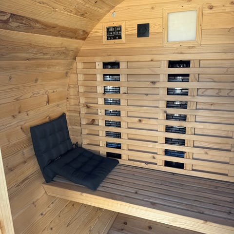 2-4 personers Infrarød sauna kabine i træ med glasdøre. Kabinen er udført i lyst træ med glaspartier i døren og siderne. Indvendigt er der infrarøde varmeelementer placeret på væggene samt træbænke til siddepladser. I loftet ses indbyggede spots og radio/cd afspiller. Saunaen har elektronisk betjeningspanel med digital visning af temperatur og tid. Egnet til indendørs montering, f.eks. i badeværelse eller wellness-rum. Yderst velholdt - står som ny.