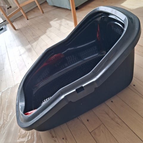 Kattebakke med låg kan stå i et hhørne