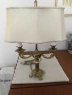 Lampe, Messing lampe med håndsyet skærm - dog har en pære sat sine “ aftryk “ på skærmen på den ene side. 40 cm høj. Og med “spir “ 48 cm høj Sælges.