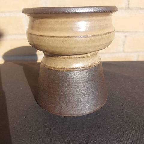 Lille enkel lysestage mærket med " Norsk Folkemuseum" K.R. i bunden. Blå og brun glasur. Diameter 10 cm.