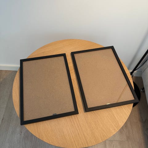 Plakater med jysk træramme. Den ene plakat har teksten “Good vibes only” på lyserød baggrund, den anden har teksten “Free your mind” på lys baggrund. Velegnet som vægdekoration i stue, soveværelse, kontor eller gang.