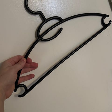 Sort bøjle med metalkrog. Plastik billet om Velegnet til ophæng af tøj i garderobe eller på tøjstativ.