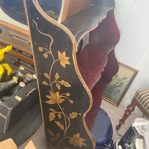 Gammel etagere / reol med drejede hjørnesøjler og tre hylder, fremstår med patina, mål: B: 54,5 x D: 33,5 x H: 72 / 84,5 cm