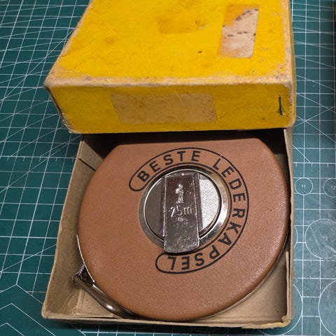 Gert Lederevalsem målebånd i læder. Rundt målebåndshus i læder med metalbeslag og oprulningsmekanisme. Målebåndet er markeret i tommer og har metaløje i enden til fastgørelse. Velegnet til opmåling ved håndværk, hobby og generelle måleopgaver.