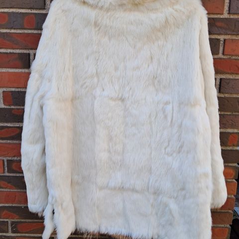 Kanin pels, hvid, sød jakke med hætte, sidelommer, og indvendige lommer. Str S/36, 58cm lang, 40cm fra armhule til armhule. Bemærk små pletter på fór ( se billeder) øverste hæftelås mangler. Seriøse bud modtages.