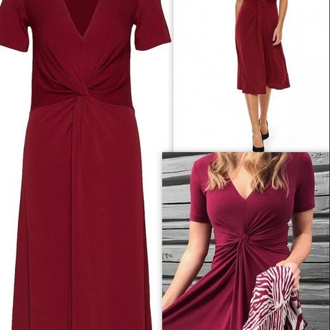 Flot kjole fra By Malene Birger med flot knudedetalje foran. Herudover er kjolen helt enkel med korte ærmer, sidder til foroven og får så større vidde fra talje og ned (se fotos). Farven er mørk oliven. Stylen hedder "Priscilla" og det er en str XL. Passer str 42/44 (materialet er 96% polyester/4 % elastan, så den er meget fleksibel i stoffet). Den er helt ny og ubrugt og stadig med alle mærker. NU NEDSAT TIL 400 KR.