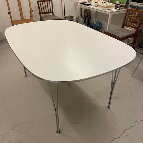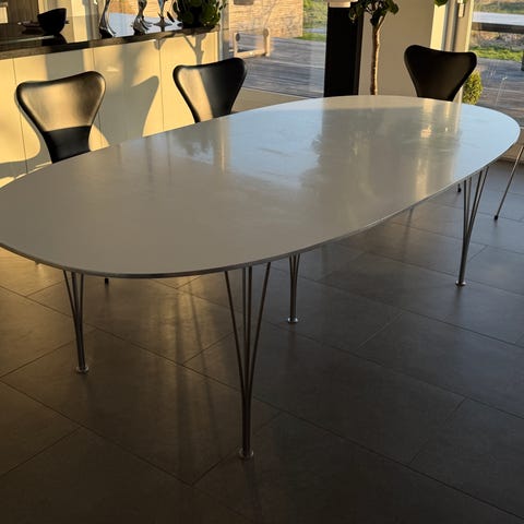 Flot ovalt spisebord med plads til op til 6 personer (inkl. siddepladser ved begge ender).
