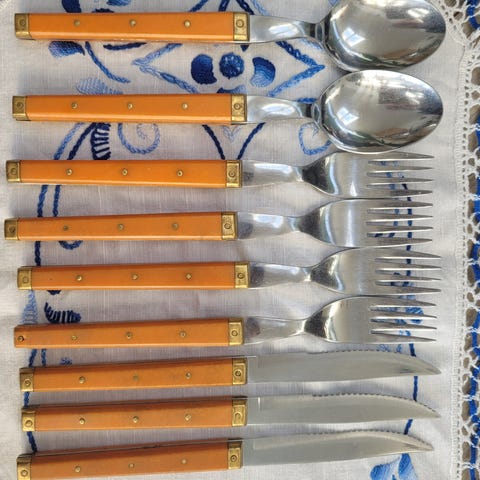 Vintage nikkelbronze bestik sæt fra James Quality Jewellers Thailand i original kasse. Bestikket er i pæn stand, har været brugt ca 1 gang om året siden 80’erne, noget af sættet stadig i plastikhylstrene. Vintage kassen har dog udvendig slitage se sidste billede. Vejer ca 11 kg