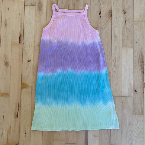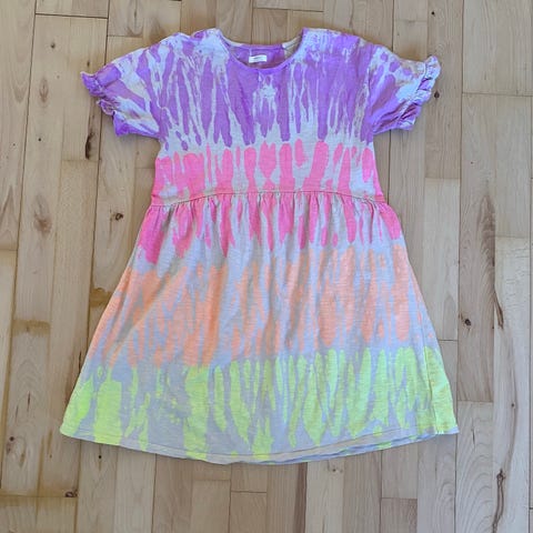 Fin sommerkjole sælges i en str 140 Gmb. Kjolen er købt sammen med tilhørende leggings, dem er der desværre et lille hul i , så de kan bare følge med hvis man er interesseret ..