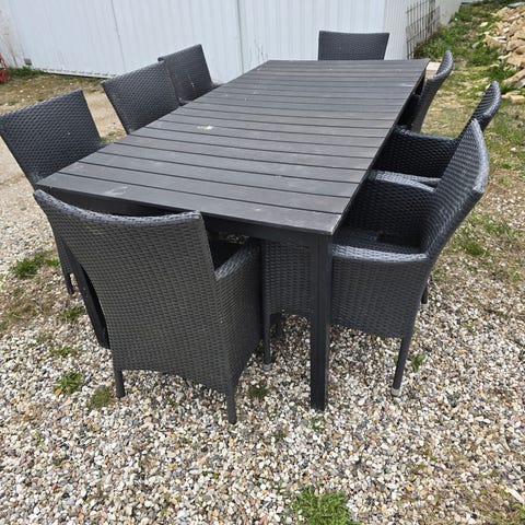 Havebord med sorte granitbordplader og tilhørende stole i sort polyrattan. Bord og stole er udført i fletlook med høje ryglæn på stolene og der medfølger sædehynder dertil. Det er meget velholdt. Bordet er robust og flytter sig ikke i en storm. Stolene er mere lette og dem har vi derfor en rem om så de bliver ved bordet.