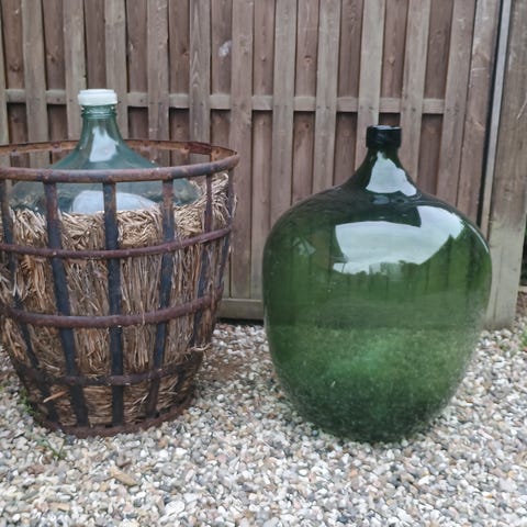 Sættet består af fire glasballoner i to forskellige størrelser, 33 cm og 24 cm høje, alle med hank og korkprop. Velegnet til hjemmelavet vinproduktion, opbevaring af væsker, dekoration eller som pyntegenstande i hjemmet. Klar glasoverflade og rund form med flad bund, så de står stabilt på bord eller hylde. Sælges samlet eller separat. Pris per styk 250,- Samlet pris 800,-