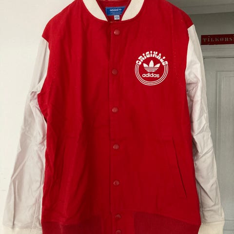 Adidas Originals herrejakke i størrelse XL. Jakken er i multifarvede nuancer med grøn front og ryg samt lyse ærmer. Materialet er bomuld polyester og uld. Designet har tryk og broderier med Adidas Originals motiver, herunder tekst og tal på ryggen samt sneaker- og logo-detaljer på fronten. Jakken har gennemgående trykknaplukning foran og brystlomme med lynlås. Velegnet som casual overtøj i hverdagen.