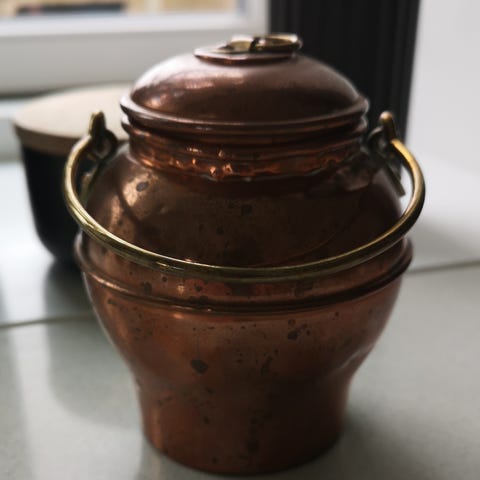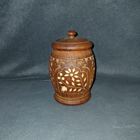 Lille krukke i træ med låg. Fin krukke med flotte træudskæringer på siderne. Diameter 9 cm. Højde 8,5 cm.