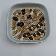 Firkantet keramikfad med glat overflade og dekorativt mønster i klare farver, perfekt til servering eller som en stilfuld dekoration.