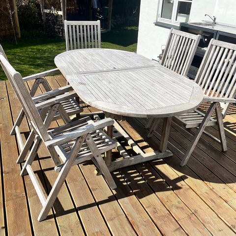 Havebordssæt bestående af rektangulært bord og flere stole. Bordplade og stolerygge/sæder er udført i træ med synlig patinering. Stel på både bord og stole er i metal med lysegrå finish. Sættet er egnet til udendørs brug på terrasse eller altan.