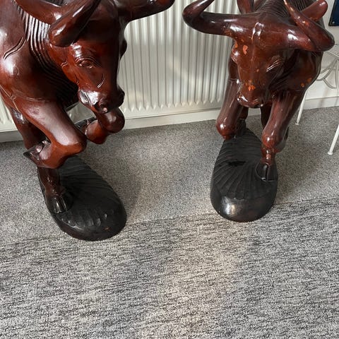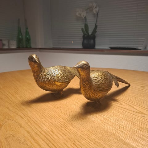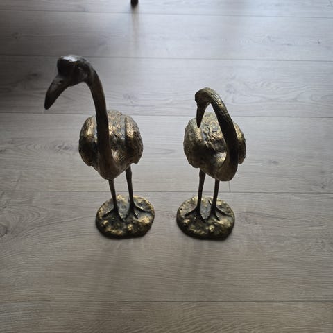 Sættet består af to fritstående thraner med lang hals og detaljeret fjerstruktur. Skulpturerne er udført i mørkt metal med gyldne nuancer på ryg og vinger. De står på slanke ben med tydelige kløer og er velegnede som gulv- dekoration. Der i alt tre mindre skrammer. Derfor prisen.