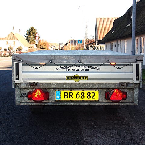 Brenderup lukket trailer med én aksel og bagdøre. Traileren har fast kasseopbygning med plane sider og tag samt bagdøre. Traileren leveres nysynet. Årlig vægtafgift 212 kr. Nyttelast 450 kg, og totalvægt 750 kg.