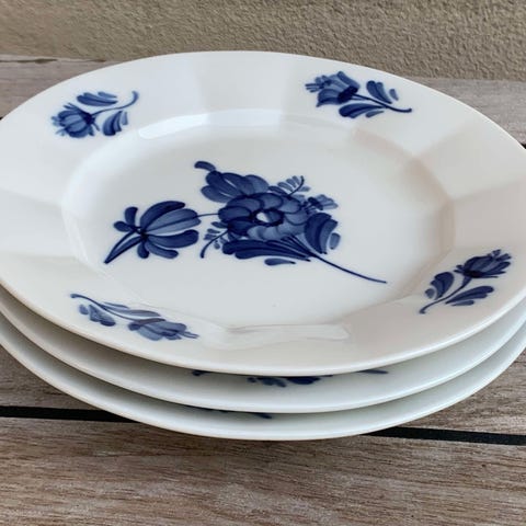 Royal Copenhagen Blå Blomst kagetallerkener i hvid porcelæn med blå blomstermotiv. Klassisk rund form med let relief langs kanten. Der er 7 stk. Diameter er 16cm - pris pr. stk. 50 kr. Kun afhentning.