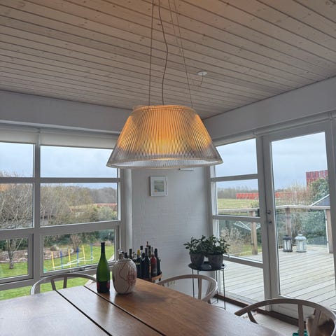 Romeo Moon Suspension 2 er en loftpendel designet af Philippe Starck for Flos. Skærmen er lavet af presset glas. Højde 22,5 cm og diameter på 50 cm. Lampen er i rigtig fin stand.