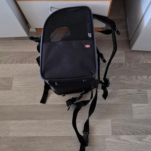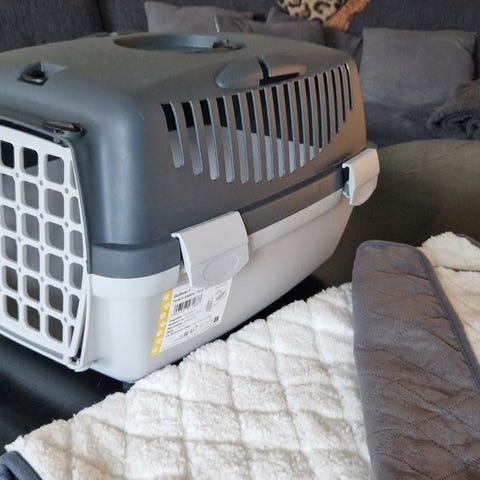 Fin transportkasse brugt til flyrejse én gang til min franske bulldog på ca 12 kg.