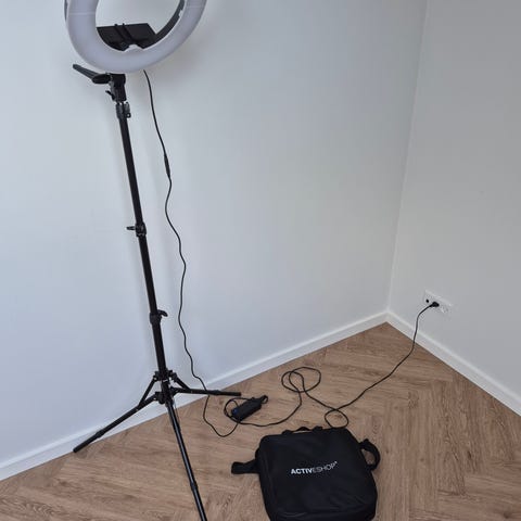 Ring light lampe med stativ og mobilholder. Lampen er monteret på et justerbart gulvstativ med tre ben og kan vinkles efter behov. Rund LED-lyskilde giver jævn belysning, egnet til fx videooptagelse, streaming eller foto. Indbygget holder til smartphone i midten af ringen. Tilsluttes strøm via medfølgende adapter og kabel.