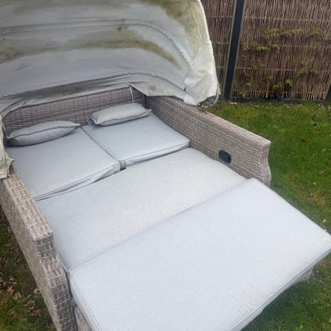 Bunden er fjeder/metal og man ligger fantastisk i den. Enderne kan klappes sammen og den kan f.eks hænges på en væg.