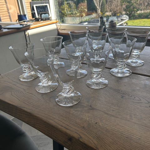 Har 6 stk. det ene har et lille afslag på toppen af kummen og et andet lidt slør i glasset under fremstillingen, kan ses på de to sidste billeder.