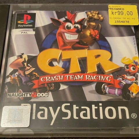 Sony Playstation Crash Team Racing spil. Fysisk spil på disc i original plastboks til den oprindelige Playstation-konsol. Racing- og gokartspil i Crash Bandicoot-universet med flere figurer og baner. Velegnet til brug på kompatible Playstation-systemer, der kan afspille originale Playstation-spil på disc.