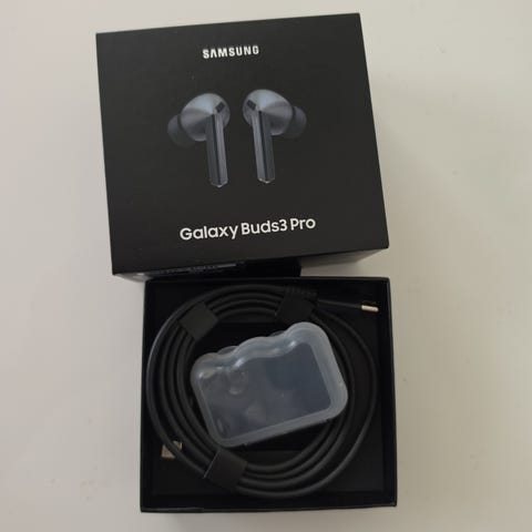 Samsung trådløse in-ear høretelefoner i sort med kompakt opladeetui. Etuiet har USB-C opladestik og er designet til opbevaring og opladning af ørepropperne.