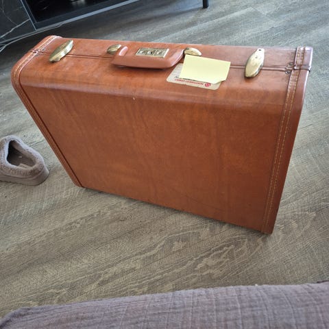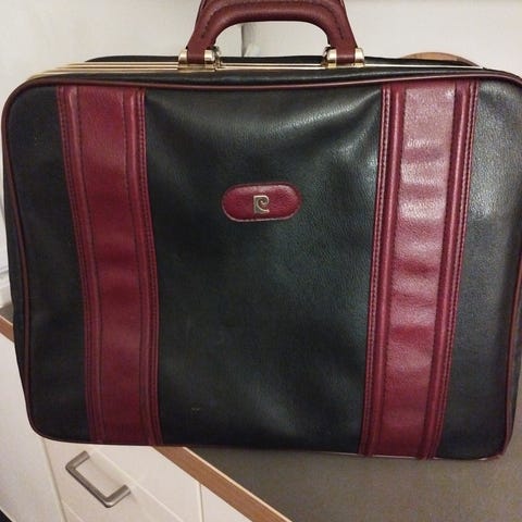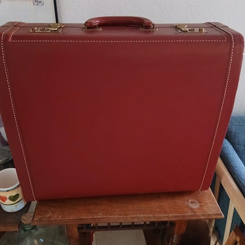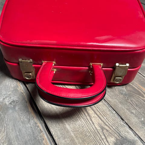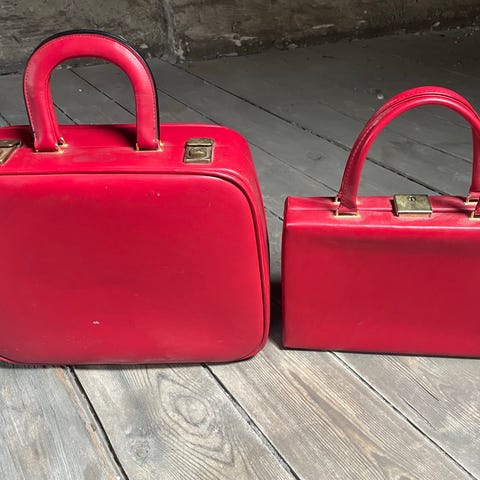 Fed vintage stof taske i stof til både mænd og kvinder. Den er rød med mørke kanter, rektangulær og holder formen godt. Der er et håndtag øverst, og den lukkes med to lynlåse. Perfekt som en lille rejsetaske eller til opbevaring. Materialet er tekstil/kanvas-agtigt med synlige strukturer. Den er virkelig flot, når man tænker på, hvor gammel den er. 38×31×12cm.