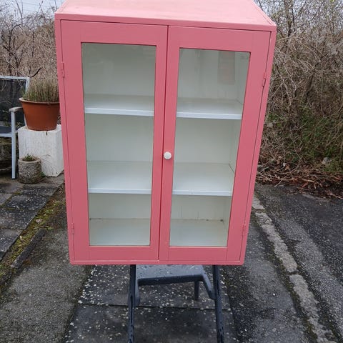 Lille væghængt vitrineskab i fyrretræ. Måler 75 i bredden, 38 i højden og 32 i dybden.