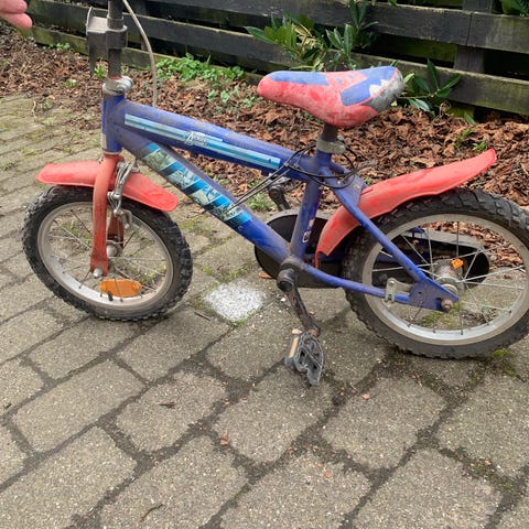 Køreklar Batman-børnecykel 14" i sort og blå. Cyklen har støttehjul, kædeskærm, kraftige dæk og sadlen kan justeres. Fod- og håndbremse. Næsten ikke brugt. Helt ny slange i fordækket. Nypris 900 kr.