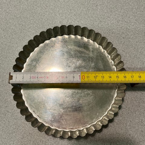 Små runde tærteforme i metal med bølget kant. Diameteren er ca. 8,5 cm, som vist på målebåndet på billedet. Formene er velegnede til små tærter eller desserter. Leveres som sæt med flere ens forme, som kan stables for nem opbevaring. Prisen er for 10 stk