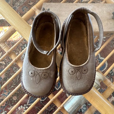 • Flotte lilla begyndersko med fint blomstermønster og rem med velkrolukning. Skoene er lavet i blødt læder med en god støtte til de første skridt. Standen er god men brugt, med lette brugsspor på snuderne.