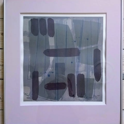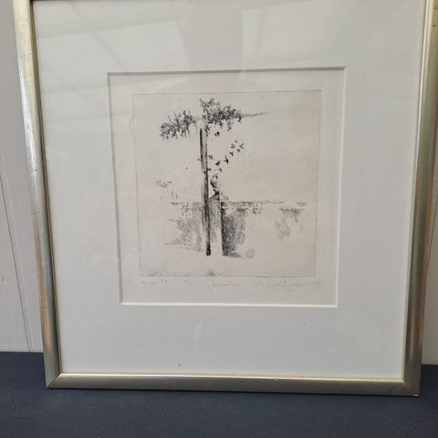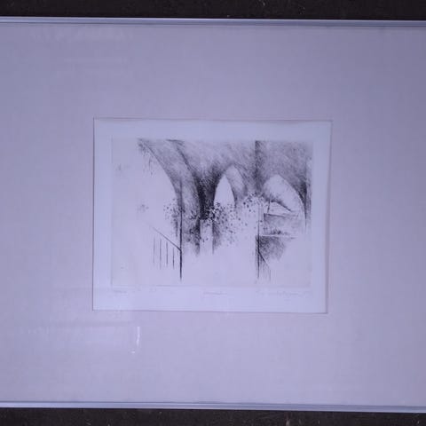 Signeret Litografi 1984, Opus 133, nr. 3/100 af Pia Schutzmann maler, grafiker og billedhugger indrammet med mørk egetræsramme og monteret med museumsglas.