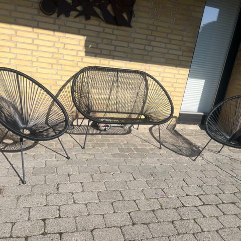 Acapulco stol i sort med metalstel og sæde i plast-snore. Stolen har rund, skålformet siddeflade med åbent flettet design og slanke ben. Velegnet som loungestol til terrasse, altan eller have.