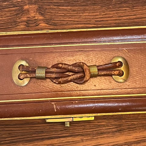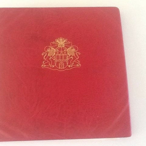 Brun pung i læder med præget emblem på forsiden. Pungen har flere indvendige rum i harmonikamodel, som giver plads til opdeling af indhold som kontanter, kvitteringer eller små papirer. Indersiden fremstår i lysere læder. Velegnet som simpel opbevaringspung eller dokumentmappe i mindre format.
