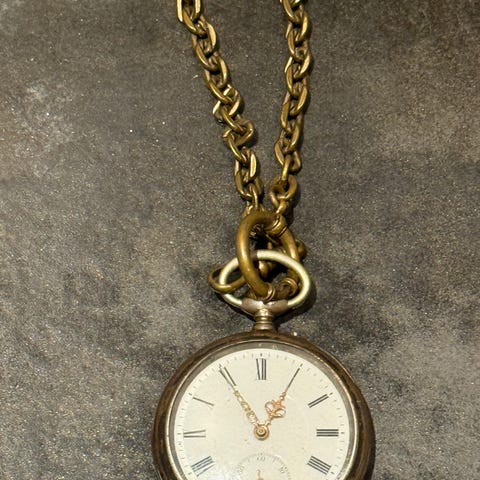 Lommeur i sølv og kobber. 3 cm i diameter. Går ikke. Ellers i fin stand