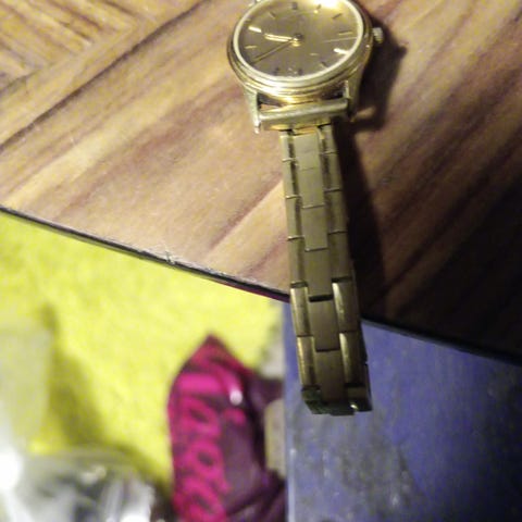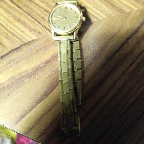 Omega dameur analogt armbåndsur. Fra ca 1960. Forgyldt med rund hvid urskive og enkle timeindeks. Uret er mekanisk med optræk via krone i siden. Urkassen er i metal med gylden tone, og der er horn til montering af rem. Designet er klassisk og enkelt, egnet til kvinder, der ønsker et lille, diskret armbåndsur.