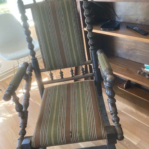 stolen er en klassisk armstol med udskåret træramme og rød- og gulstribet polstring. Den anden stol er en trægynge stol med tremmeryg, armlæn og løs hynde med mønstret stof. Velegnet som siddepladser i stue, læsehjørne eller som enkeltstående møbelstykker i indretningen.
