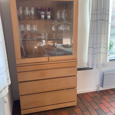 Skovby hvidolieret eg vitrine. Samlet mål 184 * 95 * 47. Skuffesektion med 4 skuffer, hvoraf den øverste er til bestik. Vitrineskab med halogen og 2 glashylder. SM85 + SM84