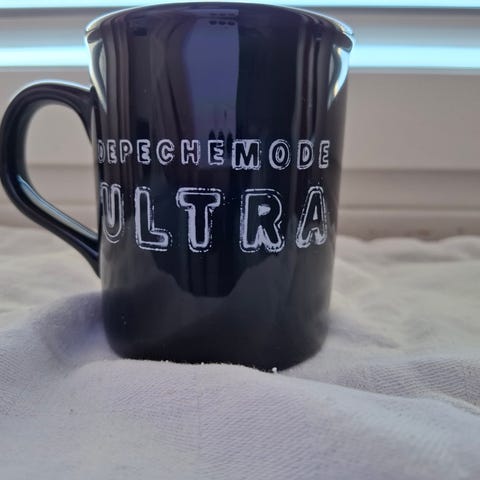 Tour Merchandise fra koncert The Singles Tour 86-98 i 1998. Kruset er udført i keramik/porcelæn med hank i siden. Ydersiden har tryk med tal i rød og hvid tekst. Indersiden er ensfarvet sort. Velegnet til varme og kolde drikke i hverdagen eller som samlerobjekt for fans af Depeche Mode.
