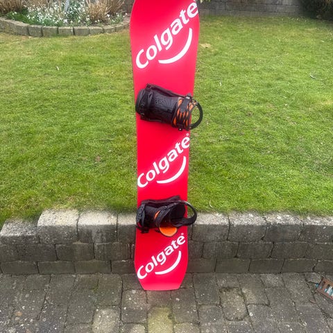 Colgate snowboard med bindinger i sort. Brættet har rød overside med Colgate-logo og sort bund med bjergmotiv. Snowboardet er udstyret med justerbare stropbindinger. Velegnet til brug i sneparker og på pister.