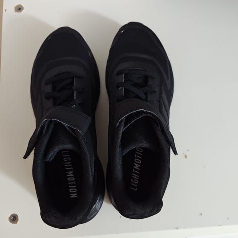 Adidas løbesko i størrelse 38,5. Skoene er sorte med mønstret overdel og snørelukning. Ydersålen har gummimønster med farvede detaljer for greb. Velegnet til løb og anden træning.