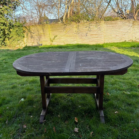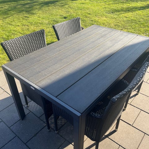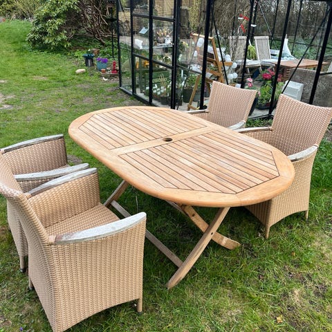 Havebord med fire tilhørende stole. Bordet har oval bordplade i træ med lameller og hul til parasol. Stel og stole er i naturfarvet fletmateriale. Sættet er egnet til udendørs brug på terrasse eller i have og giver siddeplads til fire personer omkring bordet.