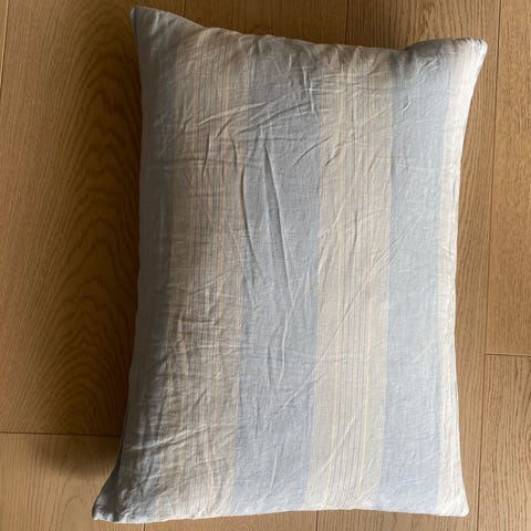 Stribet pude i bomuld - hvid med smalle striber i gråblå.