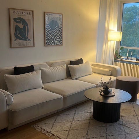 Den er en lille smule nedsunket i midten, men ikke noget man lægger mærke til meget. Og en lille tråd der er løs på venstre armlæn, burde kunne klippes af. Ingen pletter