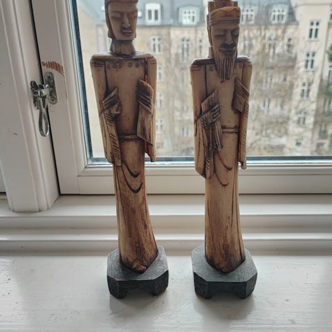 flotte udskårne benfigurer , kinesiske / asien. de er 33 og 35 cm høje. står på træfod.