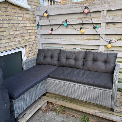 Det er købt sidst på sommeren i 2025 og hynderne er taget ind hver dag. Det fremstår nyt.