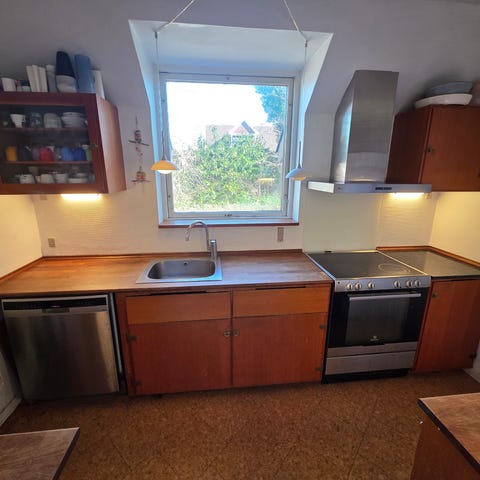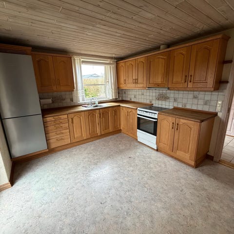 Hentes Gratis mod nedtagning. Køkken med underskabe og overskabe i massivt træ og profilerede låger. Bordpladerne er i lysgrå stenlooklaminat med tilpassede hjørneløsninger. Der er integreret plads til kogeplade, ovn, opvaskemaskine og køleskab/fryser. Over bordpladen er der vægfliser i diagonalt mønster. Køkkenet omfatter desuden vitrineskab med glaslåger og skuffer, samt separat spiseplads med bord og stole ved vindue. Velegnet til nedtagning og genopbygning i andet rum, mål skal tages på stedet efter behov.